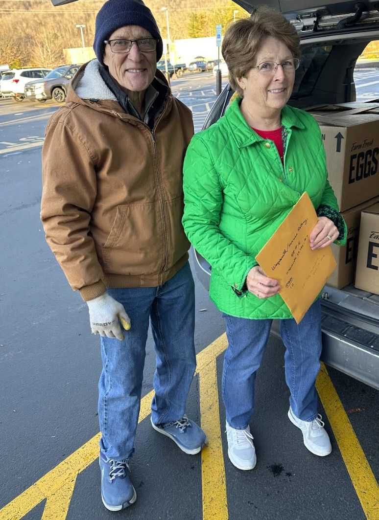 Shown in the top image is Waynesville Rotarian Ed LaFountaine and his spouse Judy as they load up for Christmas box deliveries! Shown in the image to the left are Waynesville Rotarians (l - r) Ed LaFountaine, Jack Ewing, Rick Smith, Larry Leatherwood, Dean McMahon, Tom Knapko, and Wells Greeley as they loaded the 500+ Christmas boxes for 2025.